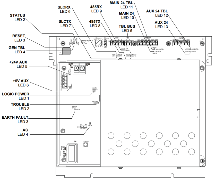 전원반 혹은 베터리의 장애가 발생하는 경우, 아래의 AMPS-24 기판에 설치된 상태 LED를 보고 문제의 원인을 파악할 수 있습니다.