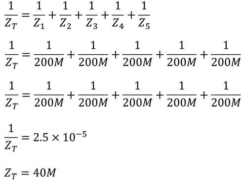 위의 회로에서 각각의 임피던스(Impedance)가 200M옴이라고 가정하면, 각각의 임피던스(Impedance)에 의해 접지 장애가 발생하지는 않습니다. 하지만, 모두 병렬로 연결되어 있으므로 아래와 같이 총 임피던스(Impedance)는 40M옴이 되며, 장애 한계 값(threshold)을 넘기게 됩니다.