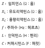이러한 임피던스(Impedance)는 R(저항), L(코일, 인덕터), C(콘덴서, 커패시터)의 합성 값이며, 그 상관 관계는 아래와 같습니다.