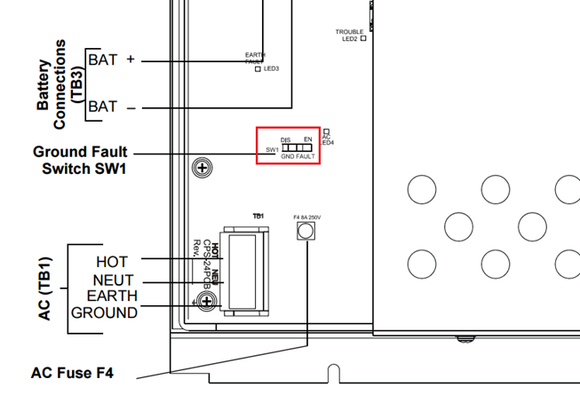 시스템 전원반이 수신기 내부 카드들에만 전원을 공급하는 경우, 해당 수신기 내부 장치에 접지 장애가 발생했다고 판단할 수 있습니다. 통신 카드(LCM-320, LEM-320)에 연결된 통신선(SLC)에서 발생하는 접지 장애는 이 장애와 다른 장애이며, 자세한 사항은 GROUND FAULT LOOP X를 참조하여 주십시오.