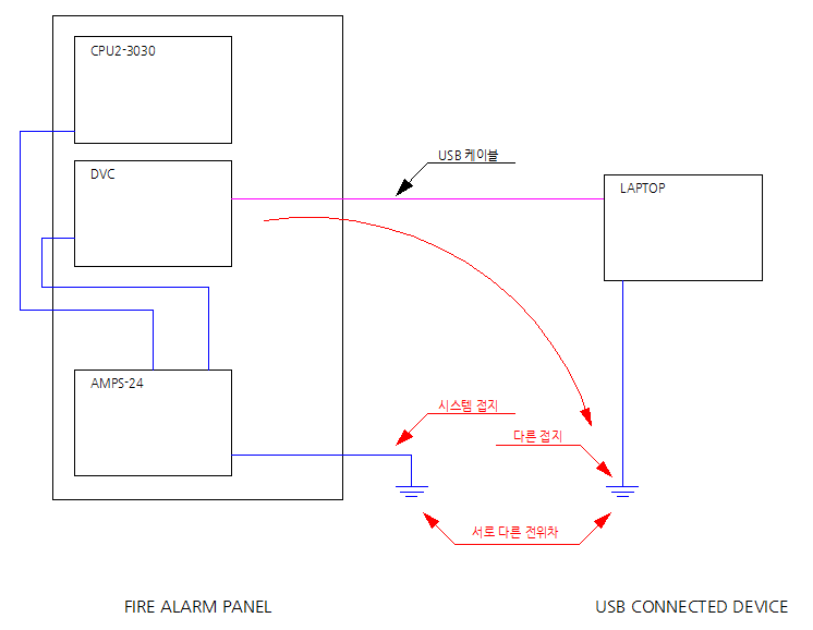 CPU2-3030, DVC, AMPS-24등 USB포트와 연결된 기기(특히 프로그램용 노트북)가 있는 경우, 제거하여 주시기 바랍니다. USB 케이블은 연결 기기간의 통신시, 기기간의 서로 다른 전위차로 인한 기기 파손을 막기 위해, 접지 단자를 가지고 있습니다. 이때, 시스템은 이 접지 단자와 연결기기의 접지로 인하여 허용되지 않은 접지가 연결된 것으로 인식하게 됩니다.