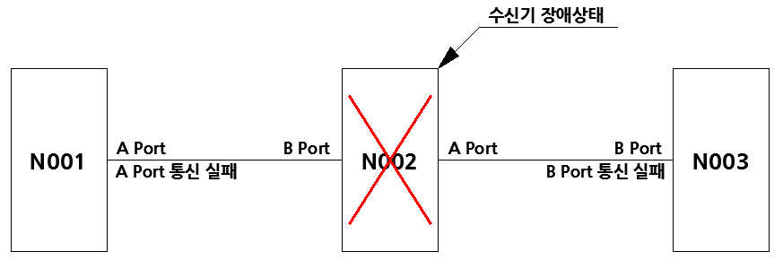 N002 수신기가 재부팅하는 경우, N001에서 "NETWORK FAIL PORT A" 장애가 발생할 수 있습니다. 이때, N003에서는 "NETWORK FAIL PORT B" 장애가 발생하게 됩니다. 또한 약 5분 후 (정상 부팅 후) N001, N003에 발생한 네트워크 장애는 사라지게 됩니다.
