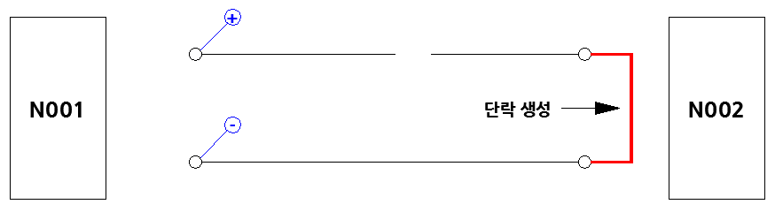 위의 그림에서 만약, N001과 N002 사이에 단선이 발생했다고 하면, 네트워크 배선의 양단을 수신기에서 분리하고 N002 수신기 쪽의 배선에 단락 (Short)을 만들어 줍니다. 그리고, N001에서 멀티테스터기를 이용하여 저항 측정을 합니다.