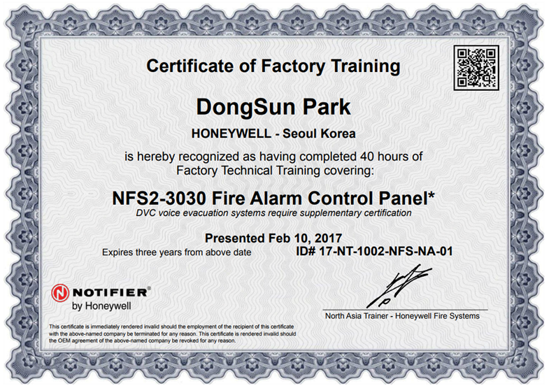 NFPA와 제조사에서는 "Factory Certified Training"을 이수하고, 유효한 "Certification"을 가진 엔지니어만이 제품의 설치(감독), 결선(감독), 프로그램, 시운전을 하도록 권장하고 있습니다.
