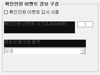 아쉽게도, 일정 시간이 지난후 매크로를 이용하여 해당 이벤트에 확인 명령을 자동으로 실행하는 기능은 구현되지 않습니다. 하지만, 운영자가 확인명령을 수행하지 않을 경우, 자리를 비운 것으로 보고 특정 출력 기기(예 : 타워램프)를 동작시키는 것은 가능합니다. 사용하려면, 확인안된 이벤트 감시 사용을 먼저 활성화 시켜 주어야 합니다.