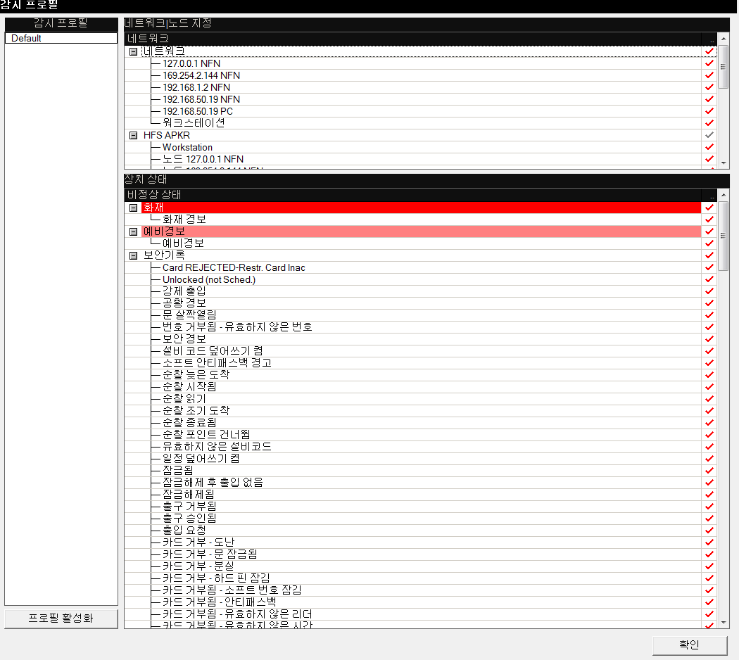 기 설정된 감시 프로필을 선택해야 합니다. 선택된 감시 프로필의 설정에 따라 이벤트를 출력합니다. 즉, 감시 혹은 보안 기능에 대해 프로필이 활성화 되어 있지 않으면, 해당 이벤트는 프린터를 통해 출력되지 않습니다.