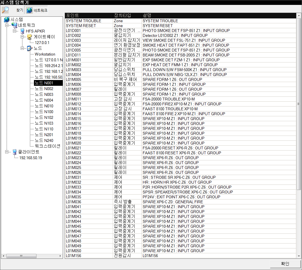 아래와 같이 특정 노드(수신기)를 클릭하시면, 설치된 포인트의 목록을 확인하실 수 있습니다. 아래의 포인트에 마우스 오른쪽을 누르시면, "확인 / 음향정지 / 복구 / 기능정지 / 기능연동/ 기동 / 정지" 등의 명령을 실행할 수 있습니다. "찾기"를 누르시면, 아래의 "장치 찾기"로 이동합니다.