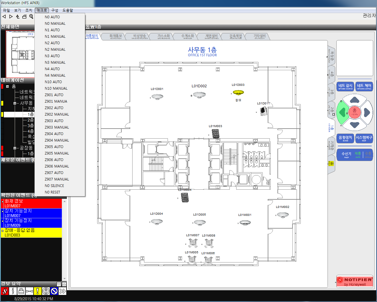 이 매크로 기능을 평면도에 버튼으로 넣을 수 있습니다. 매크로 버튼에 관한 자세한 사항은 "매크로 버튼 (Macro Button)"을 참조하여 주시기 바랍니다. 매크로 버튼보다 화재와 같은 상황이 발생되었을때, 빠르게 제어하기 위해 제공되는 기능이며, 원하지 않는 실행을 하지 않도록 주의하여 주시기 바랍니다. 원하지 않은 실행을 막기 위해 매크로는 확인 기능을 사용할 수 있습니다. 보다 자세한 사항은 "환경설정도구 (Configuration Tool)"의 "화면 구성 (Screen Configuration)", "매크로 (Macro)"를 참조하여 주시기 바랍니다.